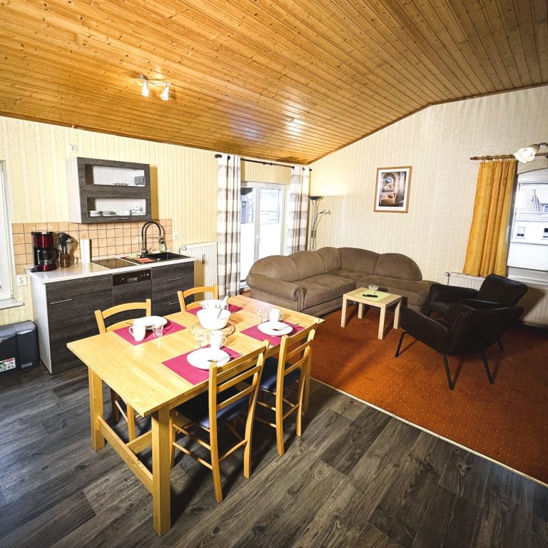 Der offene Wohn- und Essbereich mit Schlafsofa und gemütlicher Sitzgelegenheit lädt zum Entspannen ein. Die integrierte Küche ist umfangreich ausgestattet mit Kühlschrank, Backofen, 2 Kochfeldern, Mikrowelle, Kaffeemaschine, Toaster, Geschirrspüler und Geschirr. Das moderne Badezimmer verfügt über Dusche, WC, Fön und zusätzlich eine Waschmaschine.